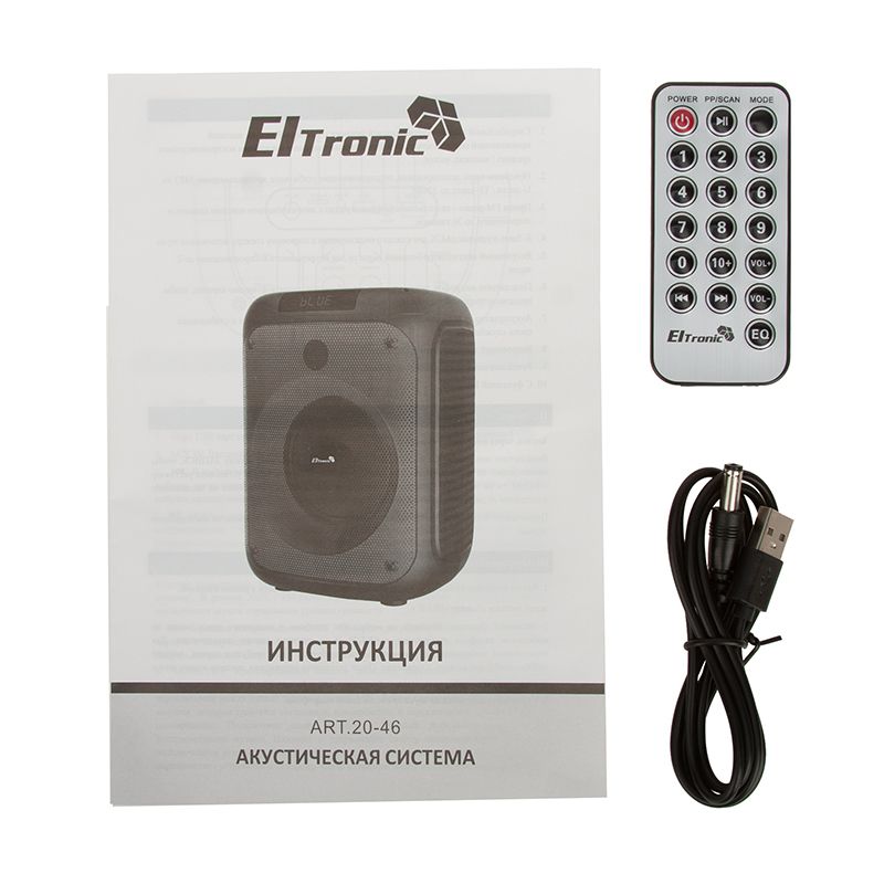 В комплект ELTRONIC 20-46 CRAZY BOX 150, помимо самой переносной колонки, входит пульт дистанционного управления (это решение оценят аниматоры, которым можно перемещаться по всему залу, а не стоять рядом с колонкой), кабель питания и инструкция на русском языке.