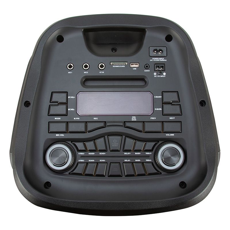 Панель управления у колонки находится сверху, так намного удобнее проводить вечеринку, не надо наклоняться, чтобы переключать композиции. На панели множество кнопок и разъемов, позволяющих настроить музыку под свои предпочтения. Хорошая функция для колонки для вечеринок – приоритет микрофона. При нажатии автоматически регулируется громкость песни, человек говорит в микрофон – песня тише, перестал говорить – песня становится громче.