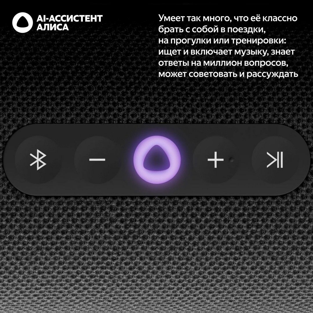 Первая портативная станция Яндекса с мощным звучанием, AI-ассистентом Алисой и ёмким аккумулятором. Берите её с собой, куда бы вы ни отправились, и управляйте любимой музыкой голосом по Wi-Fi и Bluetooth.