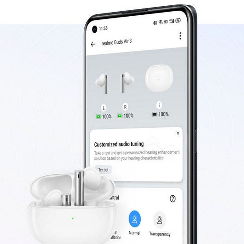 Realme Buds Air 3 подключаются к мобильному приложению Realme Link. На главной странице Realme Link доступны кнопки переключения режимов работы ANC, изменение режимов работы сенсора наушников, игровой режим с низкой задержкой 88 мс и переключение звуковых предустановок: Bass Boost+, сбалансированный и яркий.