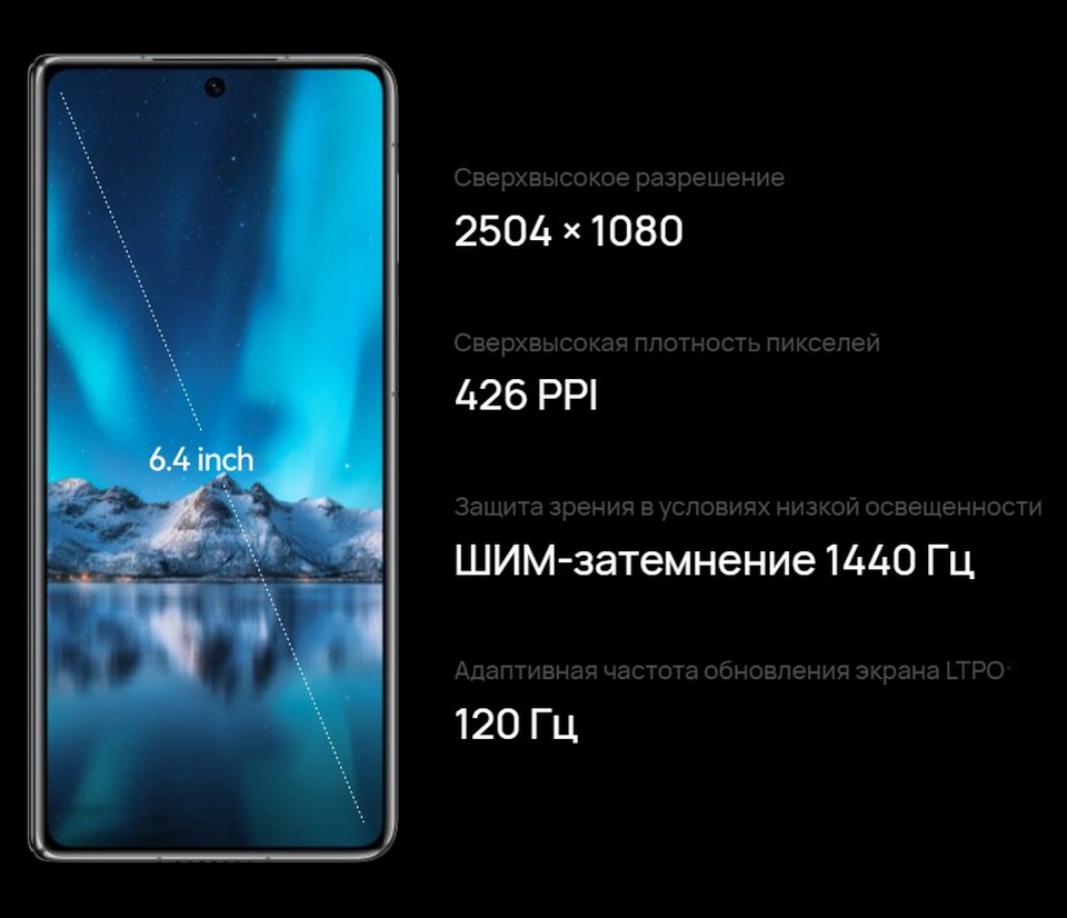 - Внешний дисплей: OLED, 6,4", 2504x1080, 426 ppi, частота обновления 1-120 Гц, ШИМ-затемнение 1440 Гц, 1,07 млрд цветов