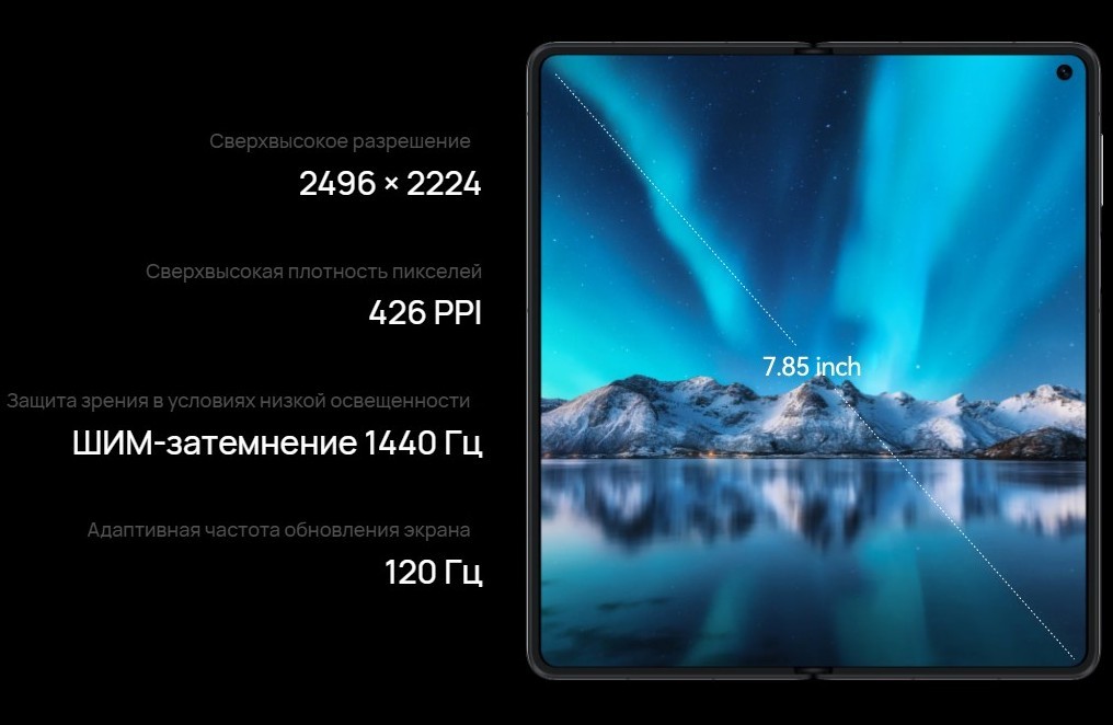 - Внутренний дисплей: OLED, 7,85", 2496x2224, 426 ppi, частота обновления до 120 Гц, ШИМ-затемнение 1440 Гц, 1,07 млрд цветов