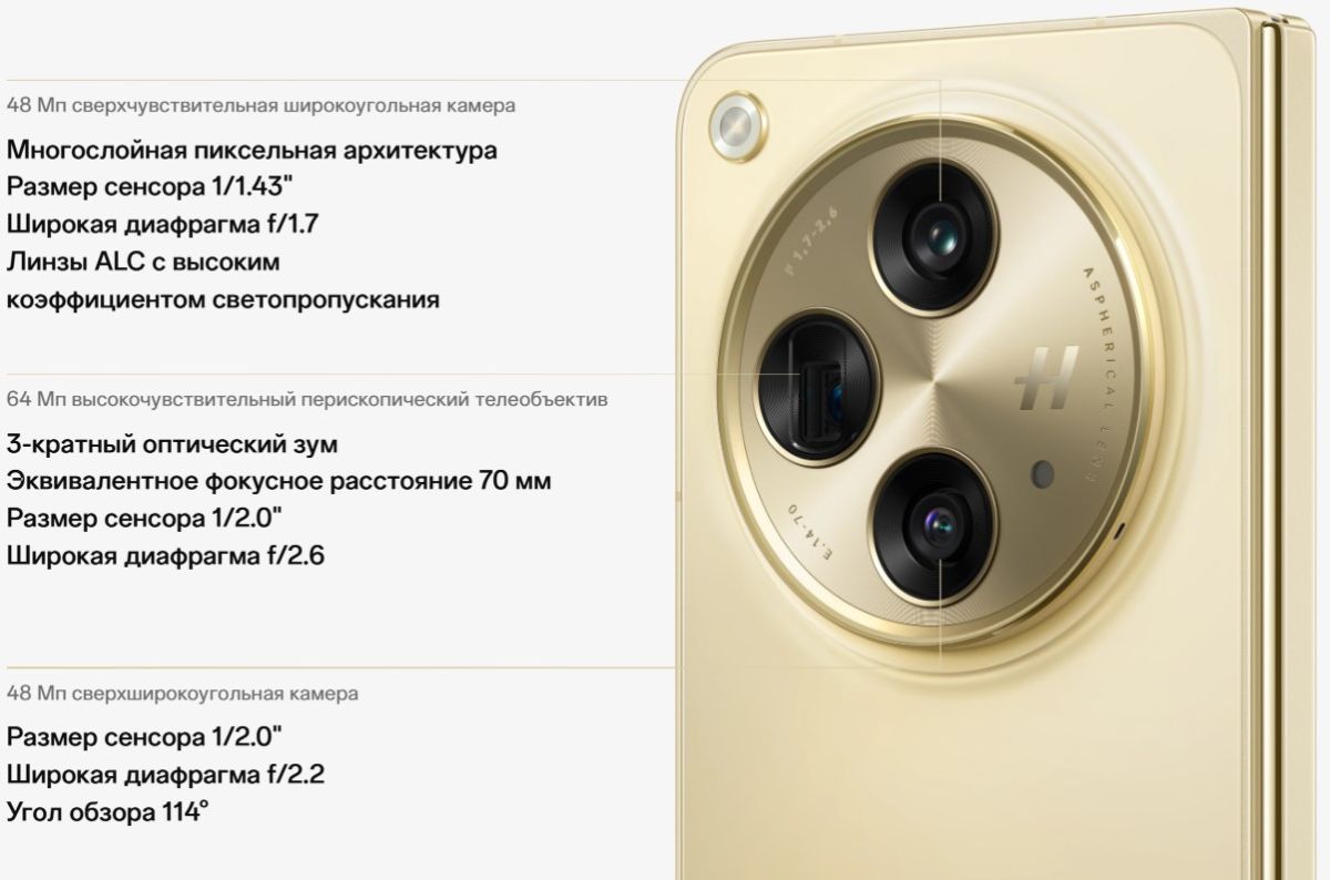 - Внешний дисплей: OLED, 6,31", 2484x1116, 426 ppi, частота обновления 10-120 Гц, частота дискретизации касаний 240 Гц, NTSC 97%, яркость 1400 нит (режим HBM), пиковая яркость 2800 нит, 1,07 млрд цветов, ультратонкое нанокристаллическое стекло