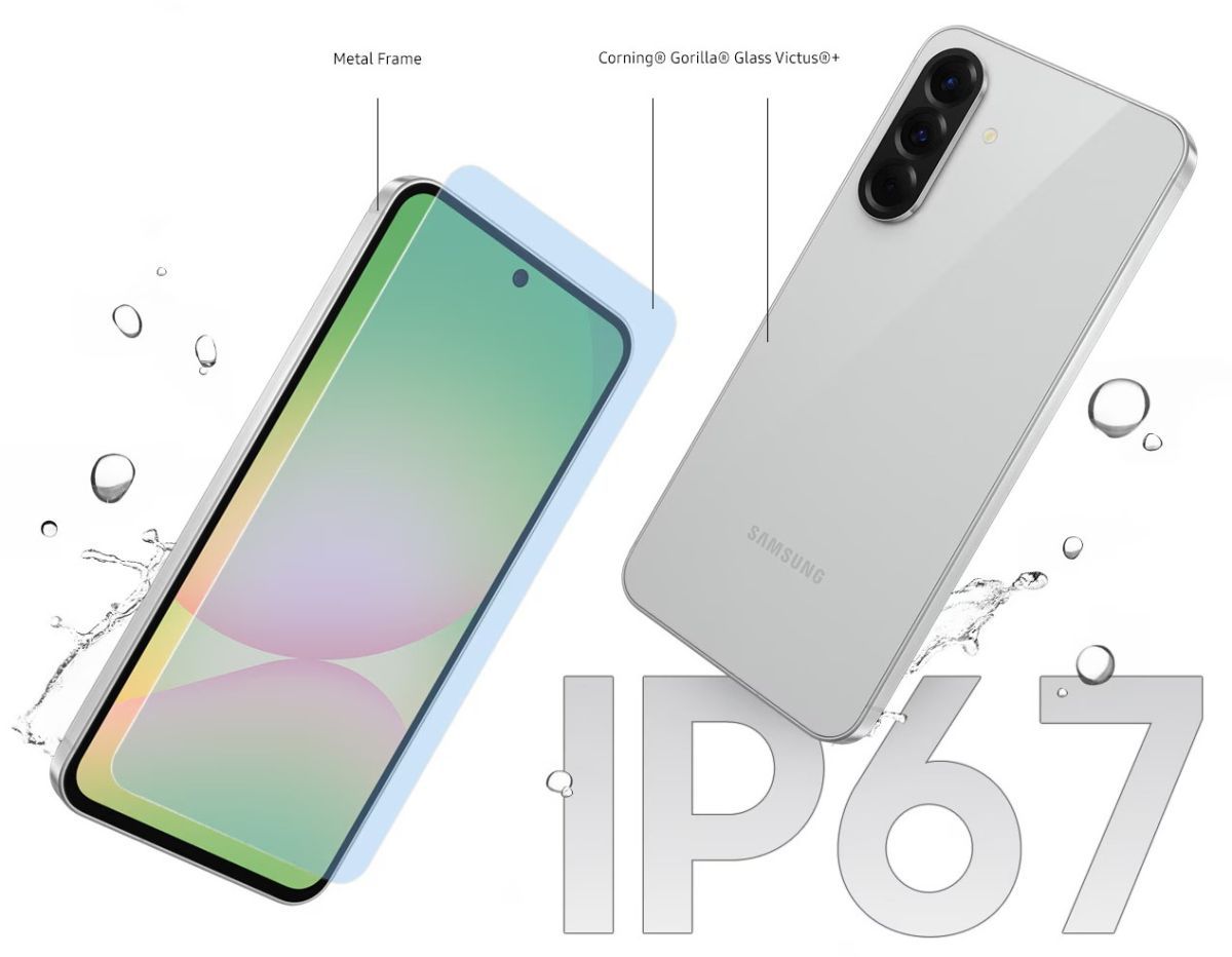 Прочная металлическая рама и стекло Corning Gorilla Glass Victus+ обеспечивают потрясающий внешний вид Galaxy A56 5G. Кроме того, благодаря защите IP67 новая серия Galaxy A защищена от грязи и брызг.