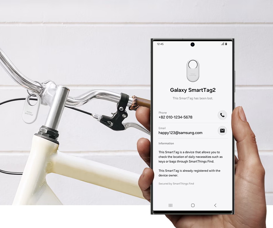 Когда активирован режим утери, NFC (Near Field Communication) Galaxy SmartTag2 отображает вашу зарегистрированную контактную информацию и сообщение на смартфоне нашедшего, независимо от ОС.