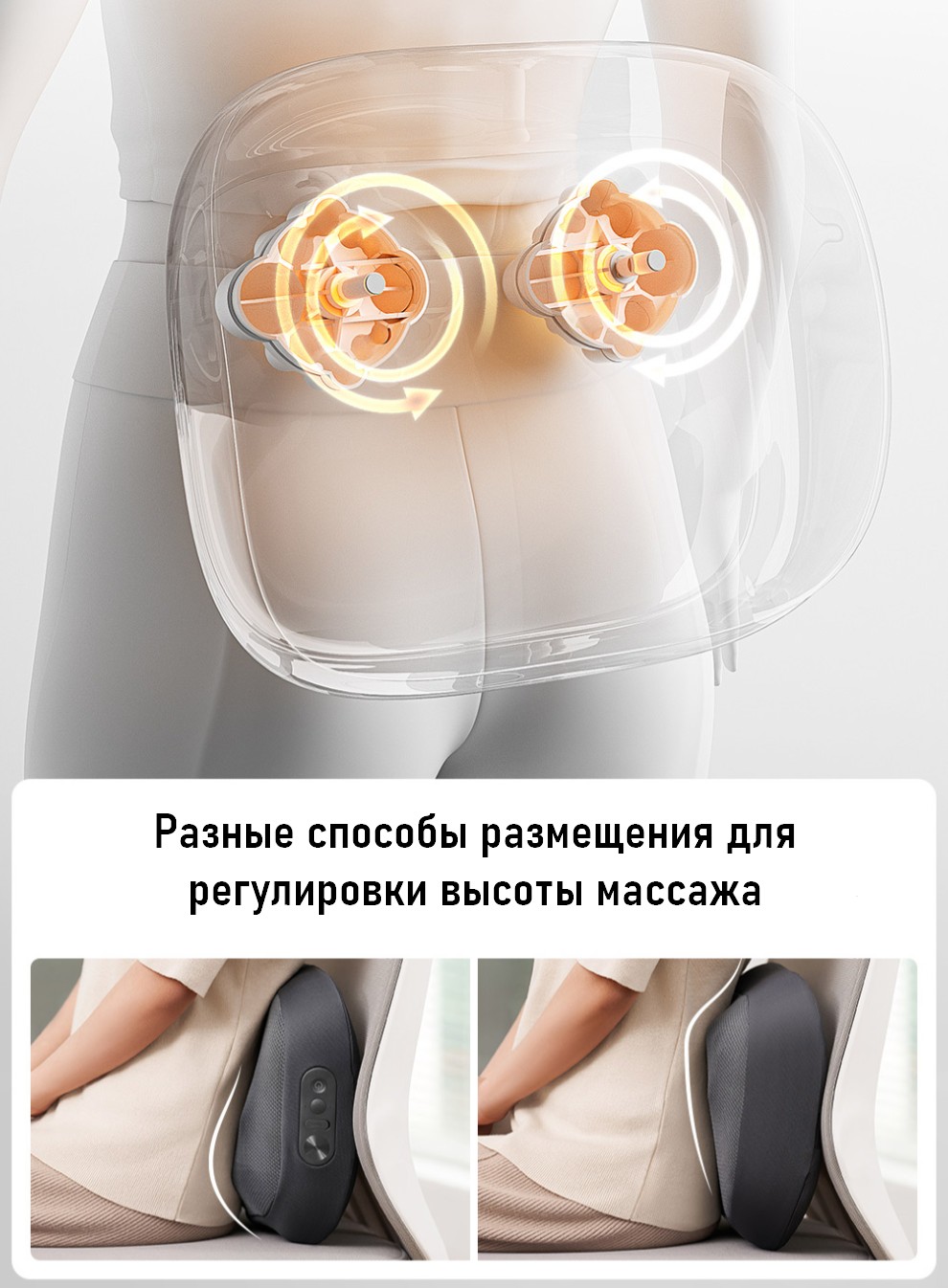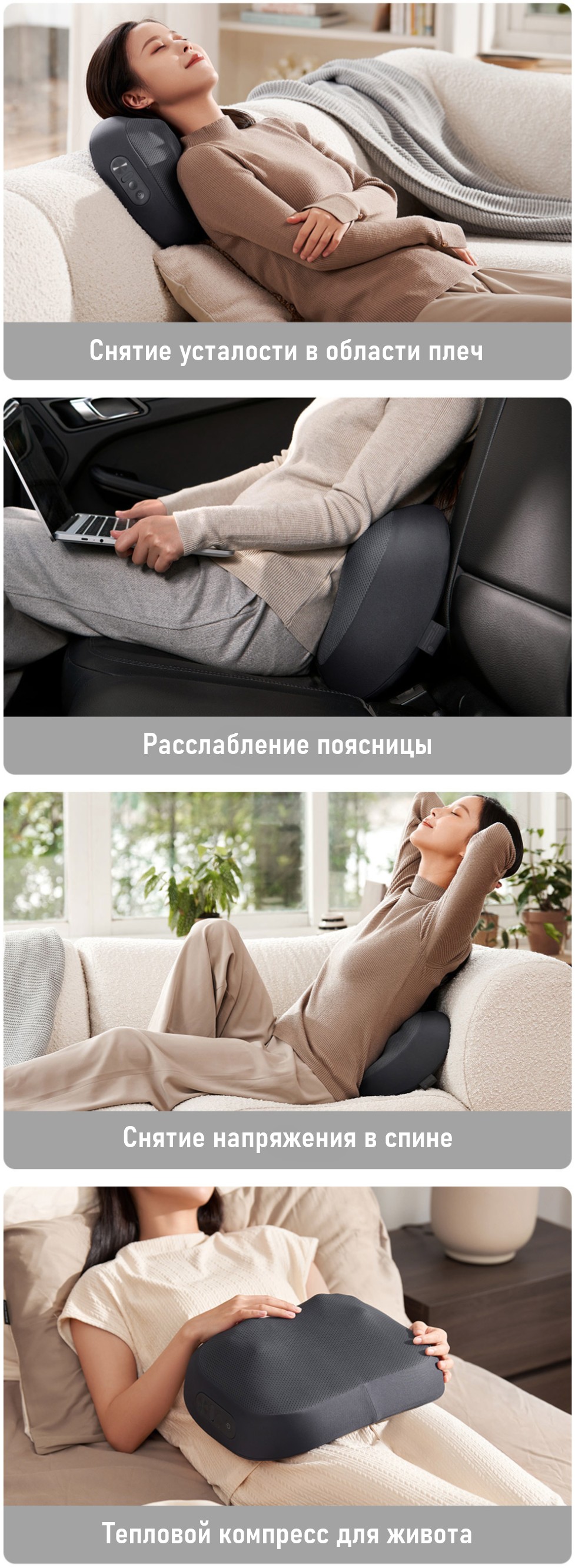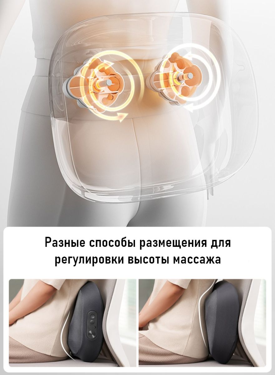 Комфортная медленно восстанавливающаяся пена с эффектом памяти обеспечивает надежную поддержку во время массажа, снимая усталость. Поверхность подушки имеет изогнутую форму, что позволяет использовать ее как обычную подушку для поясницы, обеспечивая удобную опору и максимальный комфорт для вашей спины.
