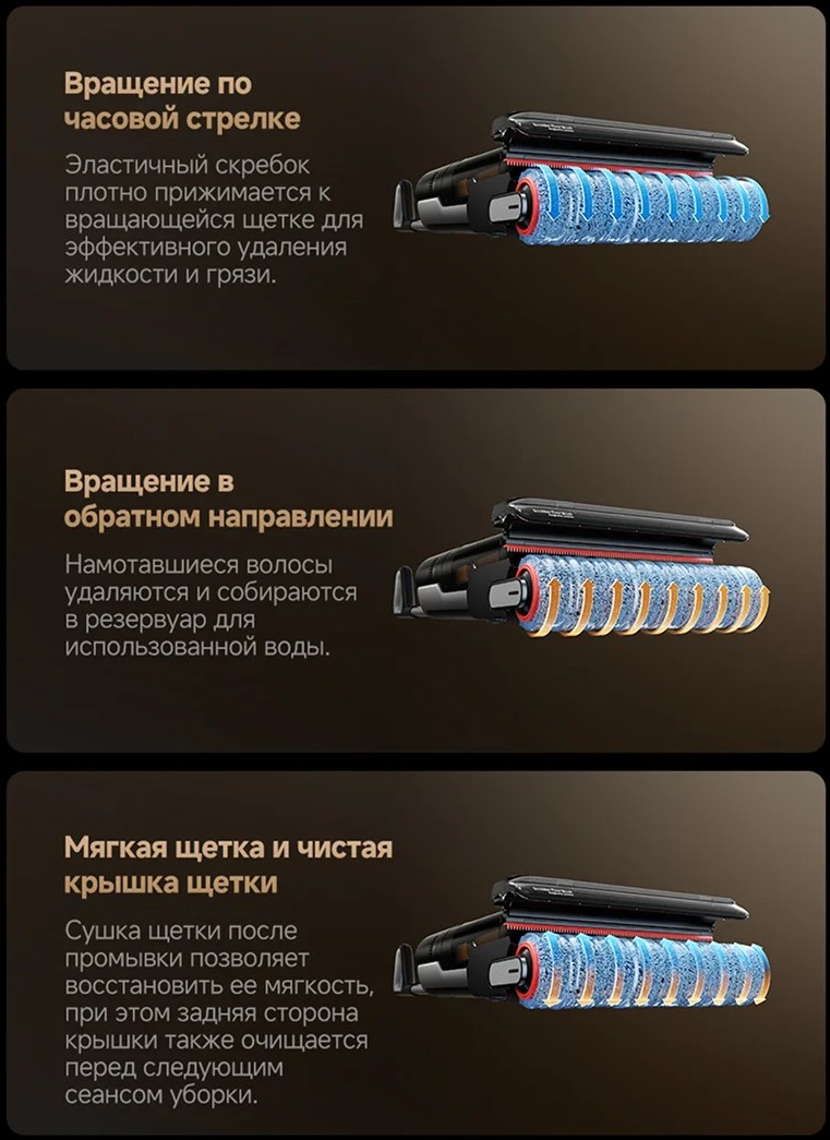 Щетка пылесоса ополаскивается чистой водой при каждом проходе.