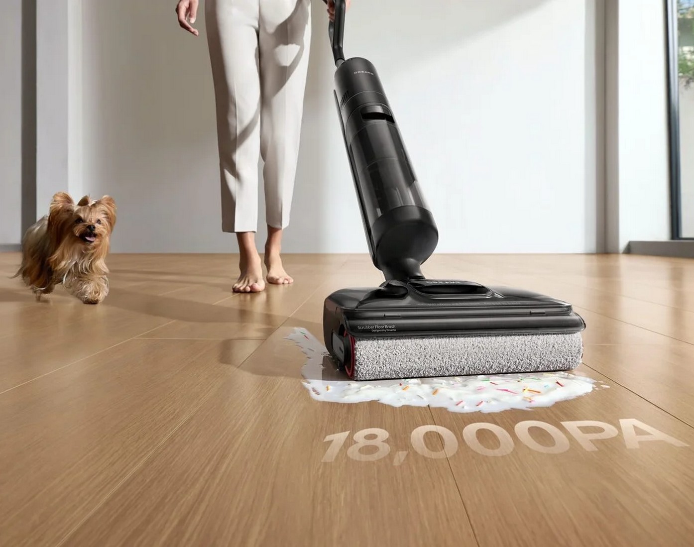Пылесос способен поддерживать мощность всасывания до 18 000 Па даже во время уборки под кроватями.