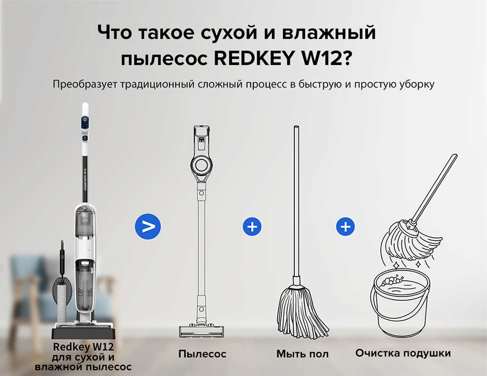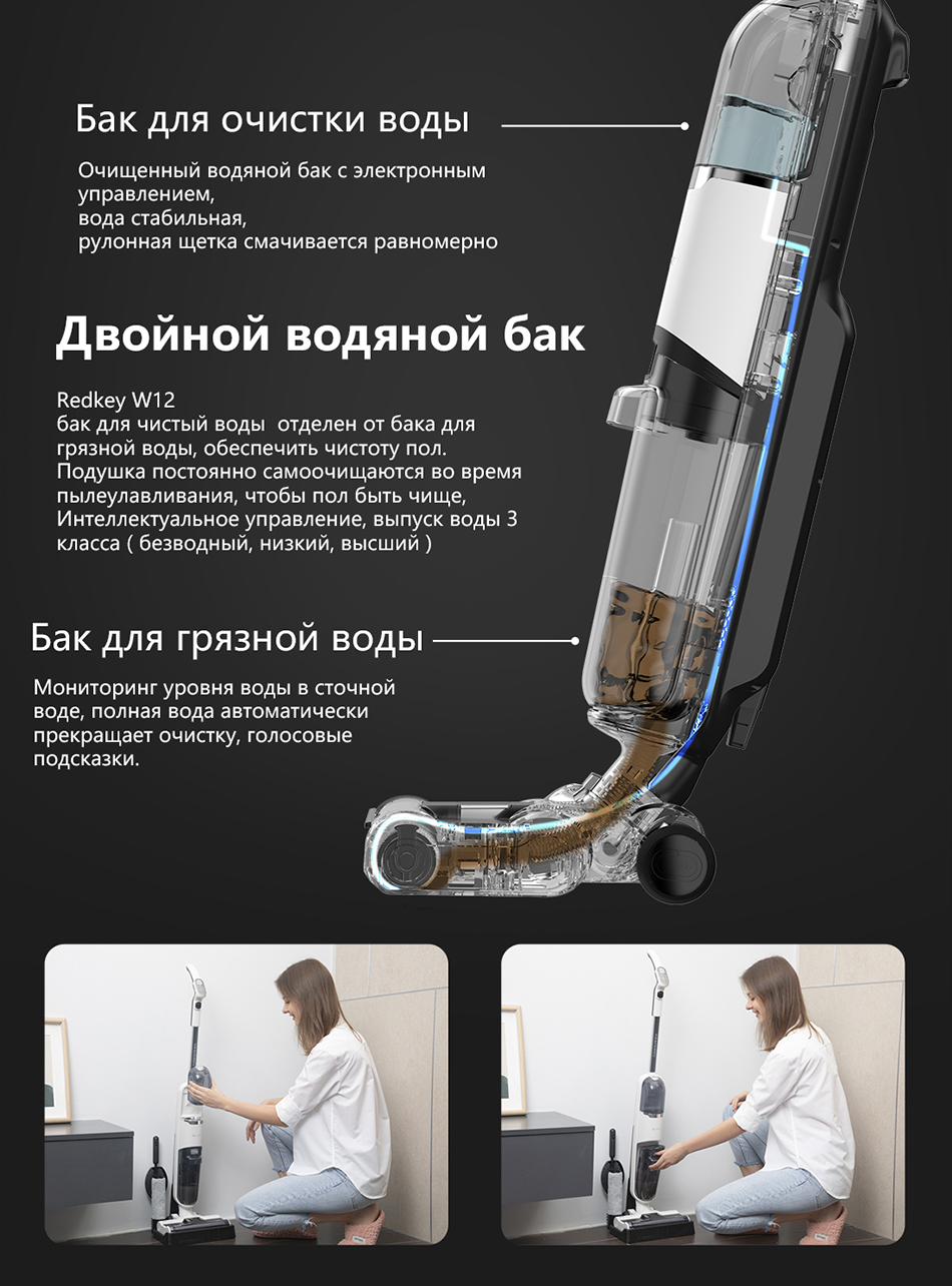 Компания Redkey использовала современные технологии и разработала новый интеллектуальный пылесос для сухой и влажной уборки Redkey W12. Аккумуляторный пылесос с мощным всасыванием легко справится с уборкой различных видов повседневных отходов. Он пылесосит и вытирает шваброй сухие и влажные отходы (кофе, еда, соусы и проч), а также самоочищается. Достаточно вернуть его на базовую станцию после уборки и нажать кнопку «Быстрая самоочистка», он автоматически очистит головку щетки и воздуховод. Все, что вам нужно сделать, это опорожнить бак для отходов.