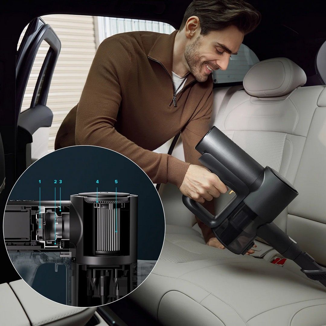 Мощный циклонный поток воздуха в сочетании с пятиуровневой системой фильтрации микронного уровня эффективно отделяет частицы пыли, в 8 раз мельче PM2.5. Это предотвращает засорение фильтров и повторное загрязнение воздуха пылью.