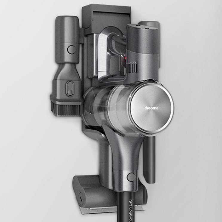 - Комплектация: основной модуль пылесоса со съёмной батареей, основная турбощетка, малая приводная щетка, трубка-удлинитель, три узких насадки (продольная щетка, поперечная щетка, щелевая насадка), гибкая насадка-удлинитель, насадка-колено, настенная база-органайзер с контактами, зарядное устройство