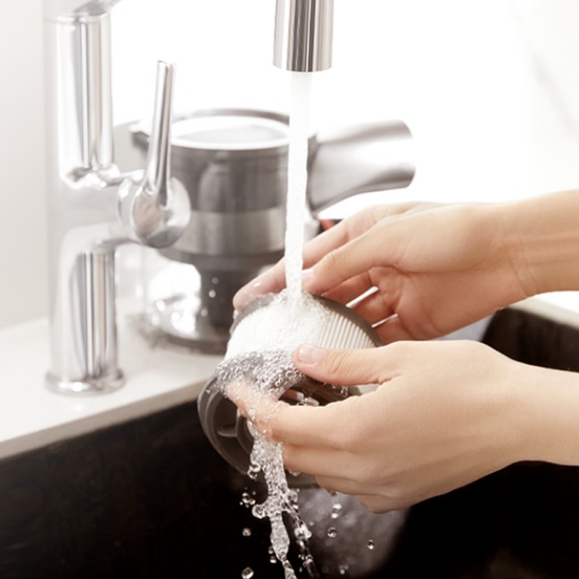 Легко чистится. Контейнер для пыли, фильтр и роликовую щетку можно мыть.