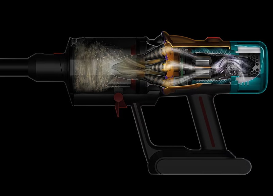 Двигатель Dyson Hyperdymium вращается со скоростью до 122 000 об/мин, обеспечивая мощное всасывание! При весе всего 2,2 кг.