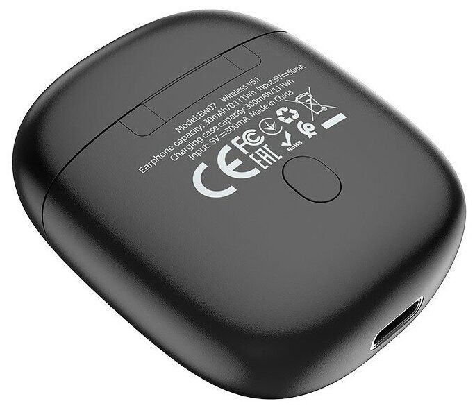 Беспроводные наушники Hoco EW07 TWS имеют энергоёмкий аккумулятор на 300 мАч, который обеспечит работу около 4 часов(120ч в режиме ожидания). Вес новинки составляет всего 38г. Размеры наушников(с кейсом) 55 * 48 * 25 мм.
