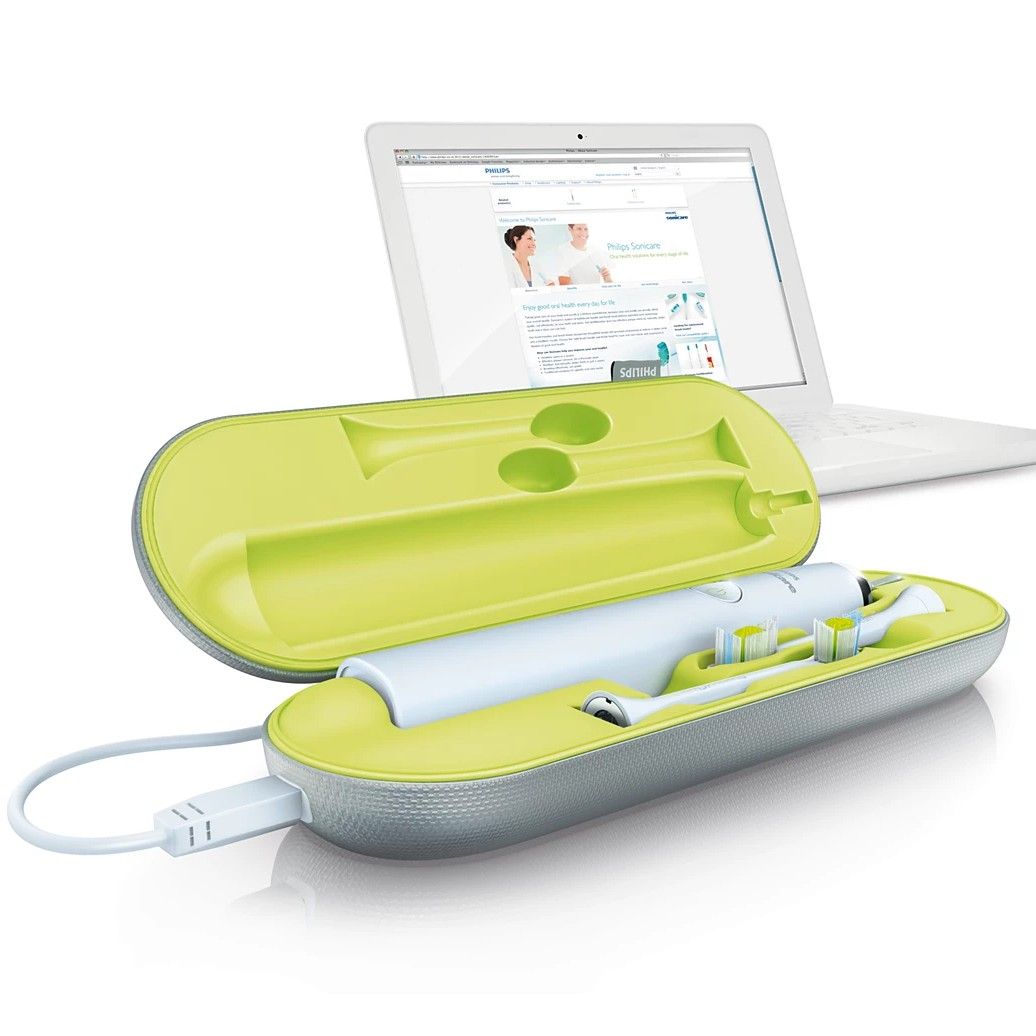 - Комплектация: Ручка зубной щетки Sonicare, 2 насадки, зарядный стакан, дорожный футляр, кабель