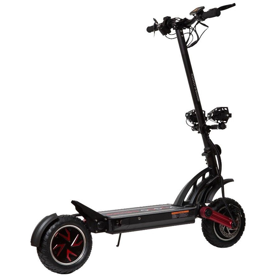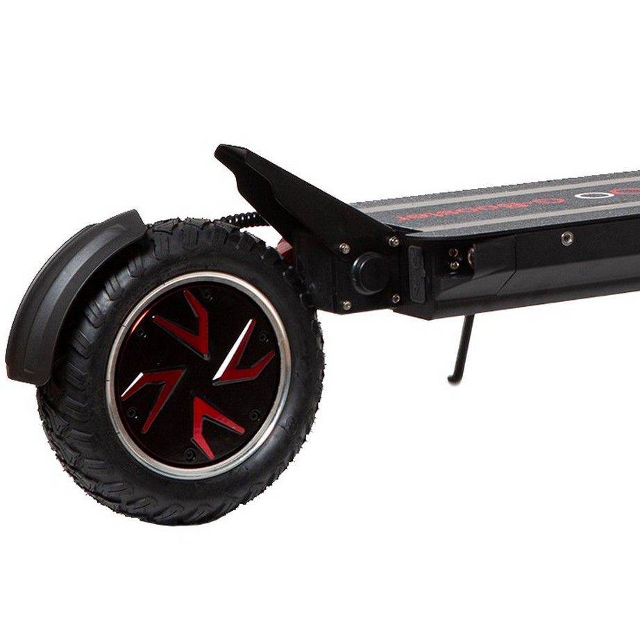 По умолчанию самокат использует задний привод. Для экономичной и плавной езды предусмотрен ECO-режим, а для любителей скорости и динамичного вождения доступен режим полного привода с турбо-опцией. В комплекте идет съемное сиденье с амортизатором, обеспечивающее комфорт при длительных поездках.