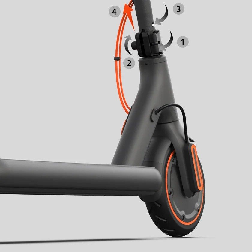 Разборка руля скутера состоит из 4 шагов: откройте зажим, ослабьте гайку зажима, затем нажмите на пружинную кнопку и поднимите руль.