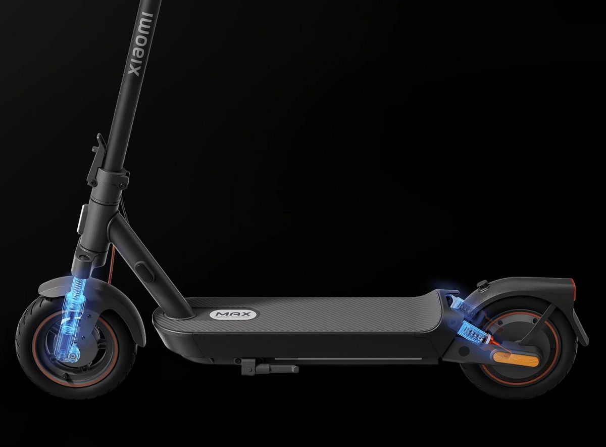 Xiaomi Electric Scooter 5 Max оснащен передней гидравлической подвеской с двойными пружинами и задней подвеской с двойными пружинами, эффективно смягчающими удары и обеспечивающими комфортную езду по булыжникам и другим неровным покрытиям.