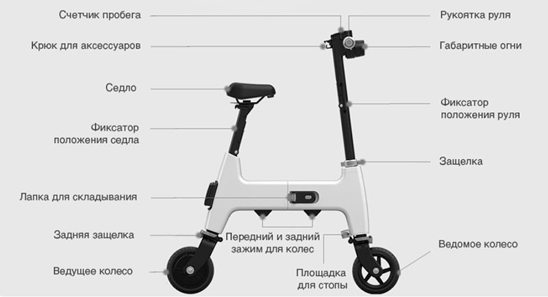 Велосипед имеет бортовой дисплей, показывающий скорость и уровень заряда батареи. Рама из алюминиевого сплава очень компактная и низкая. Благодаря высоте регулировки сидения (до 955 мм) и руля (до 840 мм), на HiMO может сесть достаточно высокий взрослый человек. Хотя H1 и выглядит очень маленьким, он рассчитан на райдера с массой до 90 кг.