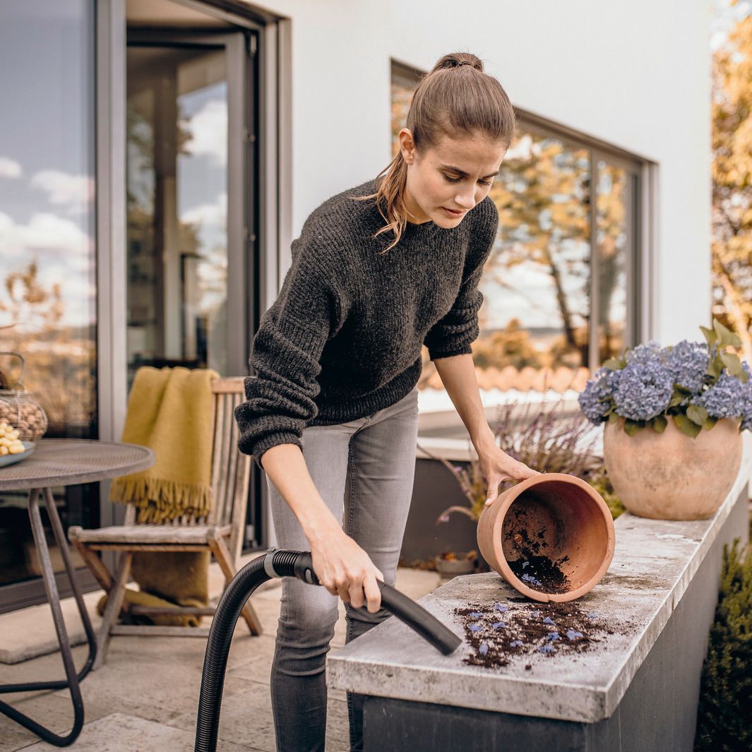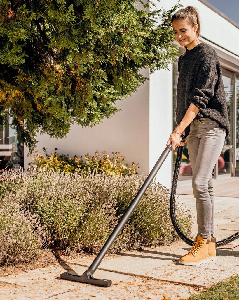 Пылесос WD 3 S V-17/4/20 с 17-литровым мусоросборником из нержавеющей стали, неразборным патронным фильтром, 4-метровым кабелем и 2-метровым всасывающим шлангом занимает мало места при хранении и сочетает высокую силу всасывания с энергоэффективностью.