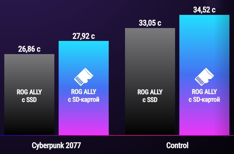 Если у вас действительно огромная коллекция игр, ROG Ally позволит легко добавить больше места для их установки. Для этого имеется слот microSD с интерфейсом UHS-II. Самое интересное, что скорость запуска игр, установленных на карту памяти, будет сравнимой со скоростью запуска с твердотельного накопителя, работающего в режиме PCIe 4.0.