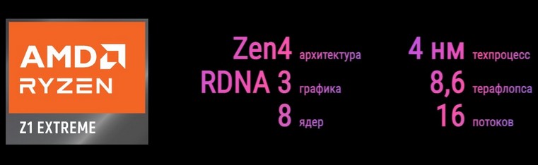- Процессор: AMD Ryzen Z1 Extreme (архитектура "Zen4" с 4 нм техпроцессом, 8 ядер, 16 потоков, 24 МБ кеш-памяти, до 5,10 ГГц)