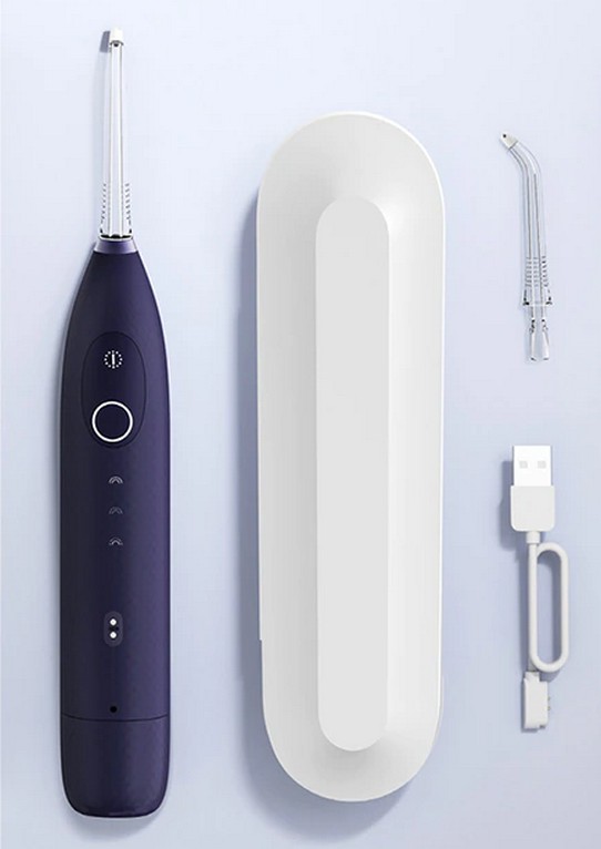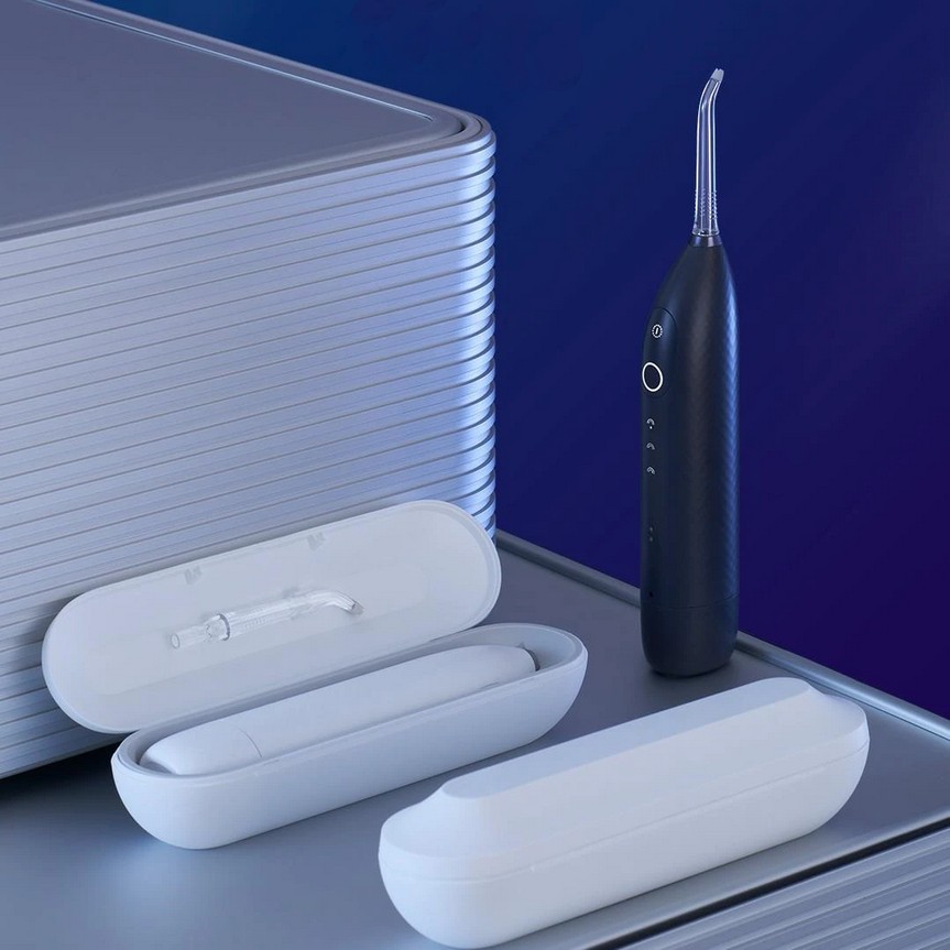 Классический дизайн в стиле минимализма. Интуитивно понятная система управления: 2 кнопки. Одна для включения/выключения устройства, вторая для переключения режимов. Материал изготовления: ABS-пластик высокого качества. Он приятный на ощупь, сохраняет внешний вид надолго. В комплект входят: магнитная зарядка и футляр, в котором можно разместить ирригатор и две насадки.