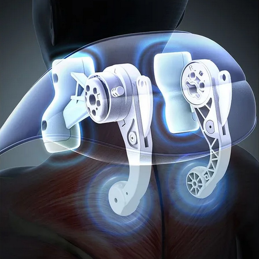 Корпус весит около 1,3 кг, что делает его легким и удобным в носке. Массажер слегка накрывает плечи и шею, не стесняя движений.