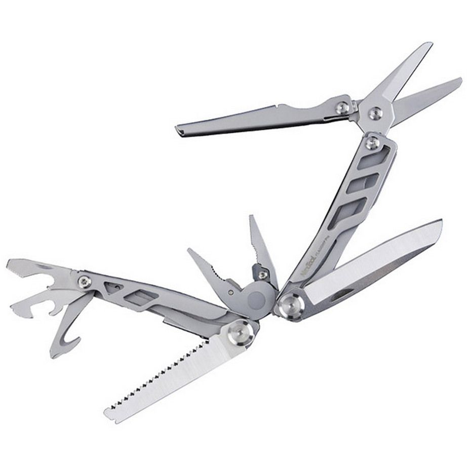 Nextool Multifunction Knife Pro — это компактный мультитул из нержавеющей стали, который предлагает множество функций. Он включает в себя большой нож, нож для снятия изоляции, велосипедный ключ, шлицевую отвёртку, нож для верёвок, открывашку, пассатижи, молоток для разбития стекла, большие ножницы, пилу по дереву и крестовую отвертку. Инструмент выполнен из нержавеющей стали и отлично подходит для срезания мелких веток и сучков. Он позволяет очистить провод от изоляции одним движением и подходит для большинства размеров винтов со шлицевой головкой. Также он может быстро перерезать стропы или канаты и открывать металлические пробки бутылок.