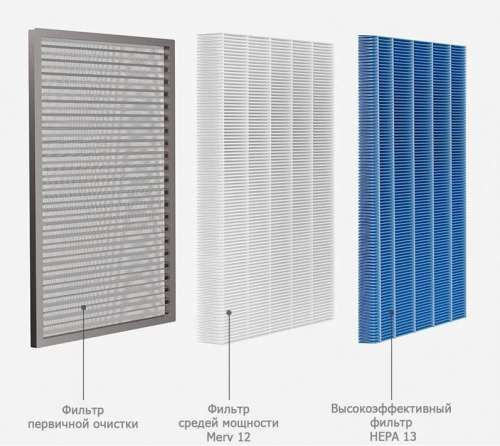 Для очистки воздуха используется 5-ти уровневая система фильтрации. Внешняя металлическая сетка сдерживает крупные частицы мусора. Промежуточный фильтр Merv12 устраняет частицы пыли, а H13 задерживает все вредные микроорганизмы и другие частицы. Эффективность фильтрации 99.99%. Достаточно просто промывать решетку 1 раз в месяц. Остальные фильтры необходимо менять каждые 3-6 месяцев.