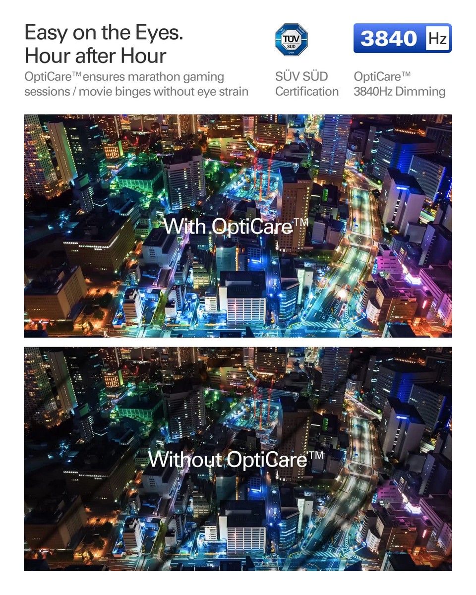 Защита зрения OptiCare: ШИМ-затемнение 3840 Гц, низкий уровень синего света и технология без мерцания — для снижения утомляемости глаз.