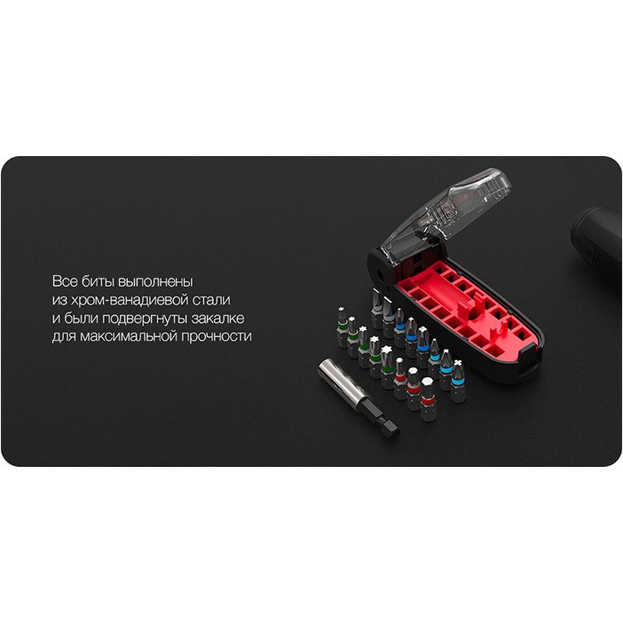 - Биты: PH1, PH2, PH3, PZ1, PZ2, PZ3, T10, T15, T20, T25, T30, H3.0, H4.0, H5.0, SL4.5, SL6.0
