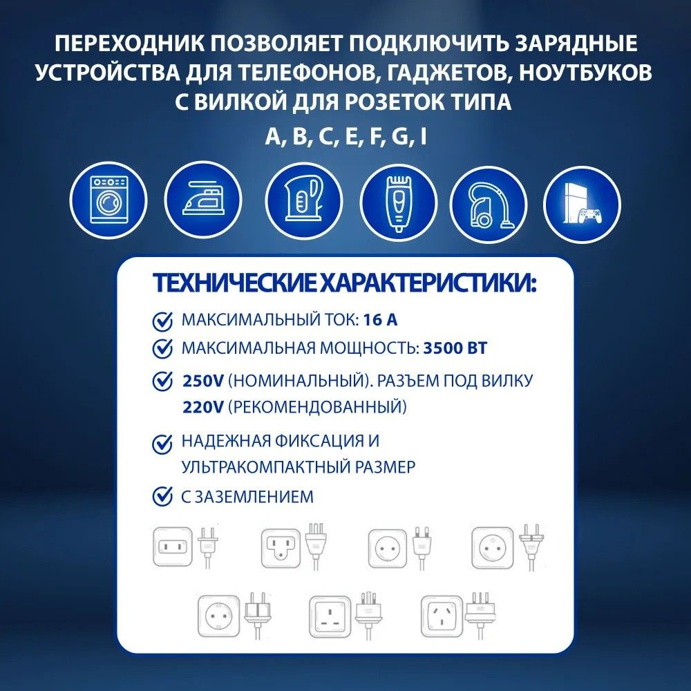 Универсальный сетевой адаптер с зеземлением.