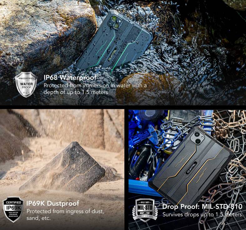 Планшет Oukitel RT3 разработан для эксплуатации в суровых условиях, в том числе на свежем воздухе. Он устойчив к падениям, вибрациям, защищён от воды, пыли. Дождь, снег, лёг, экстремальные температуры не причинят повреждений.