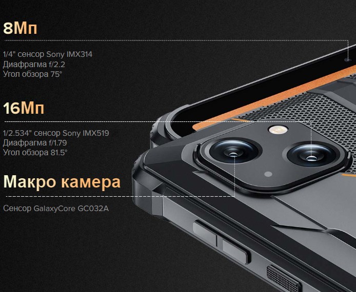 16-Мп камера Sony IMX519 с диафрагмой f/1.79 и LED-вспышкой обеспечивает великолепные кадры при любом освещении. 8-Мп селфи камера Sony IMX314 с диафрагмой f/2.2 обеспечивает отличные селфи, чёткость видеозвонков. Вы можете выбрать из нескольких режим съёмки, включая режим Beauty, Pro-режим, чёрно-белый, режим бокэ, сканер QR-кодов. Прочная конструкция позволяет запечатлеть лучшие моменты в условиях экстремальных условий и температур.