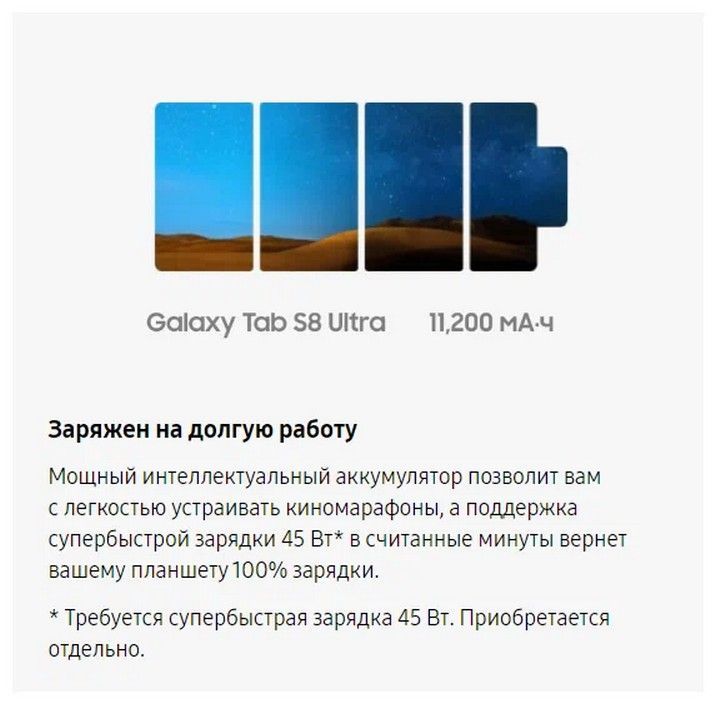 Внутренние компоненты устройства питаются от несъёмного литий-полимерного аккумулятора на 11200 мАч. Планшет поддерживает проводную зарядку до 45 Вт.