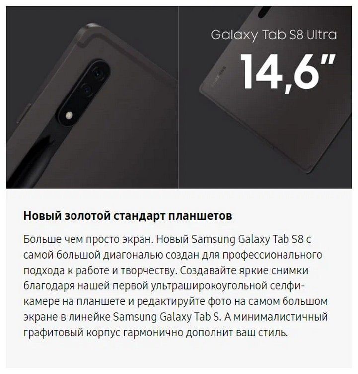 Компания Samsung обновила линейку планшетов Galaxy Tab S. В неё вошли 11-дюймовый Galaxy Tab S8, 12,4-дюймовый Galaxy Tab S8 Plus и абсолютно новый 14,6-дюймовый Galaxy Tab S8 Ultra.