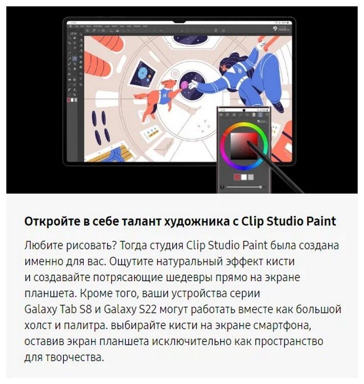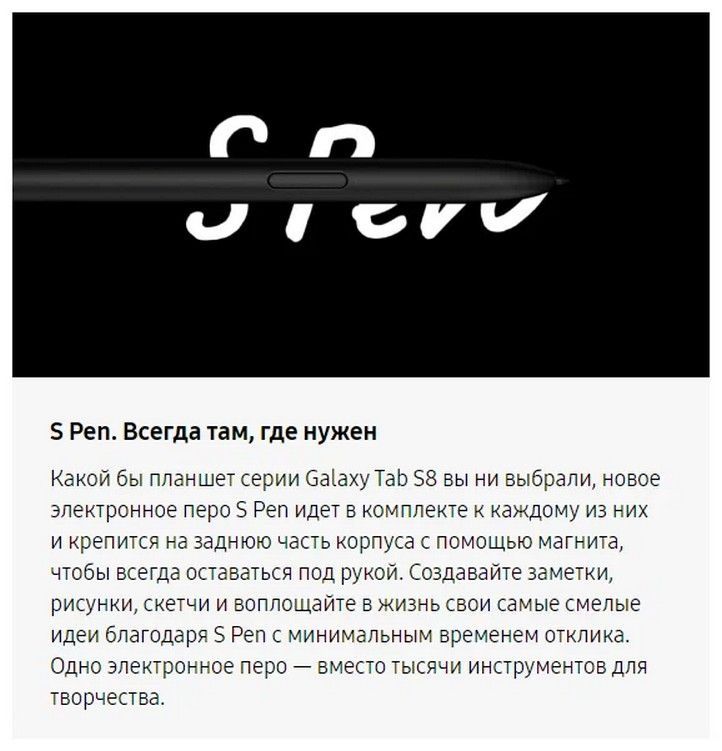 Какой бы планшет серии Galaxy Tab S8 Вы ни выбрали, новое электронное перо S Pen идет в комплекте к каждому из них и крепится на заднюю часть корпуса с помощью магнита, чтобы всегда оставаться под рукой. Создавайте заметки, рисунки, скетчи и воплощайте в жизнь свои самые смелые идеи благодаря S Pen с минимальным временем отклика. Одно электронное перо – вместо тысячи инструментов для творчества.