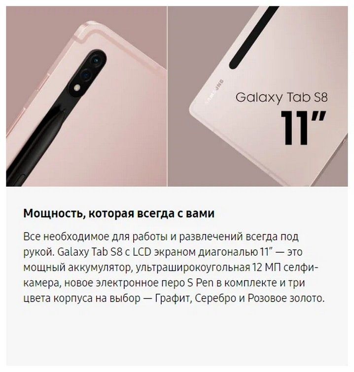 Какой бы планшет серии Galaxy Tab S8 Вы ни выбрали, новое электронное перо S Pen идет в комплекте к каждому из них и крепится на заднюю часть корпуса с помощью магнита, чтобы всегда оставаться под рукой. Создавайте заметки, рисунки, скетчи и воплощайте в жизнь свои самые смелые идеи благодаря S Pen с минимальным временем отклика. Одно электронное перо – вместо тысячи инструментов для творчества.