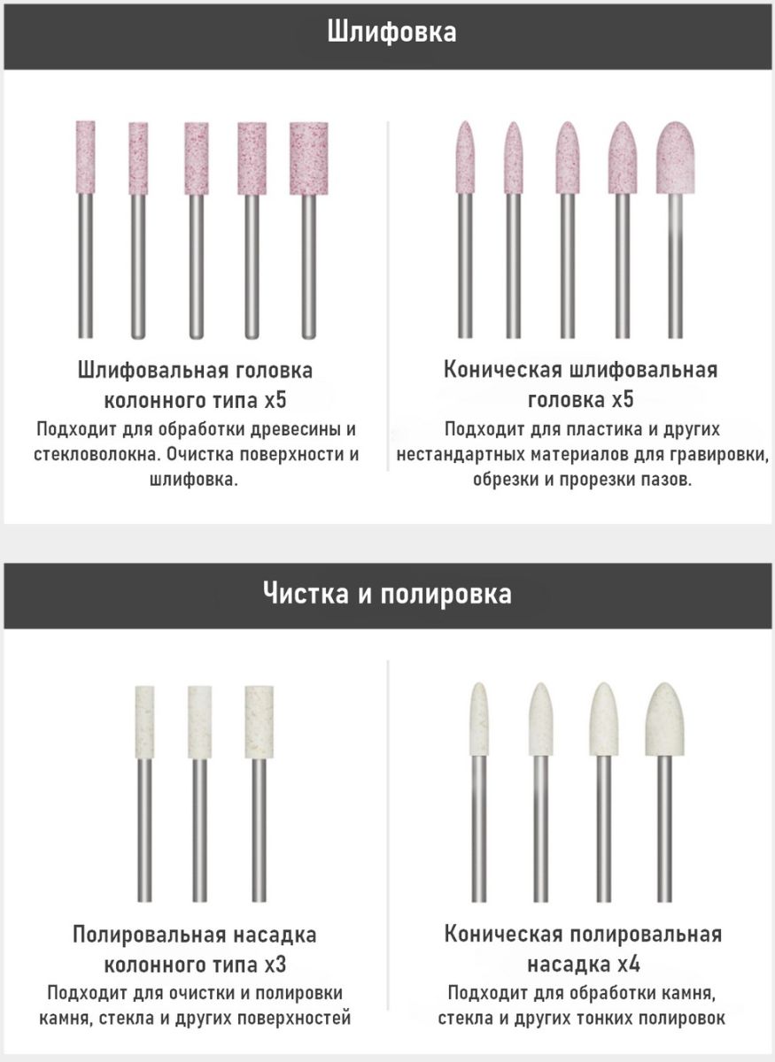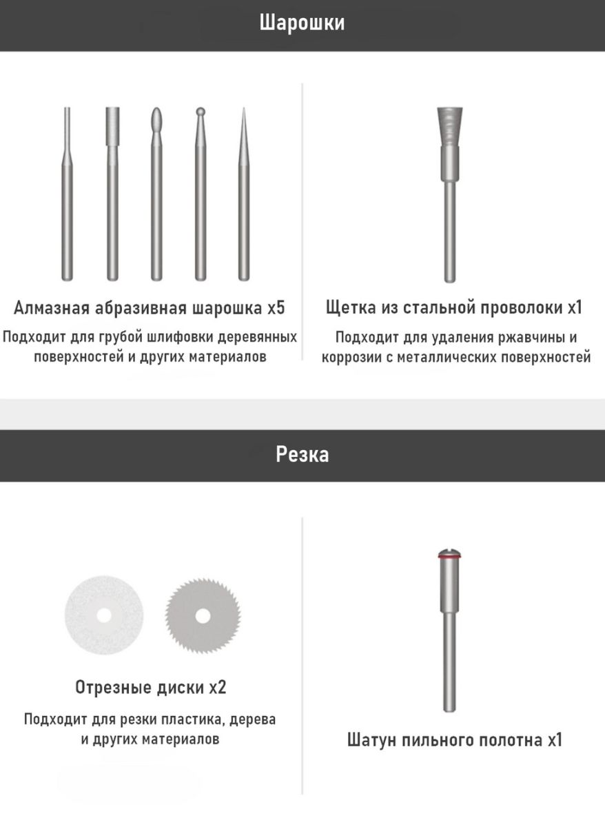 - Насадки: Абразивная насадка х23, Отрезной диск х 2, Шатун х1