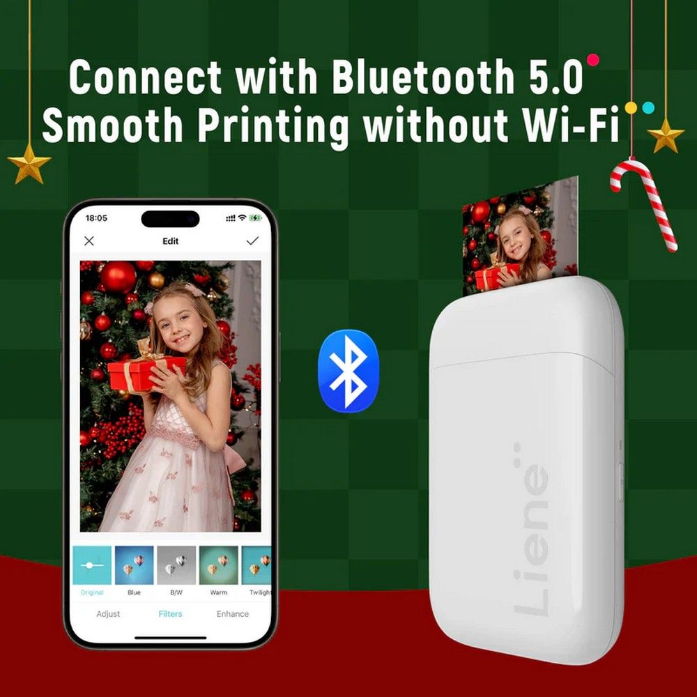 Liene Portable Photo Printer — это компактный портативный принтер для моментальной печати цветных и черно-белых фотографий в любом месте. Уникальная особенность устройства — отсутствие необходимости в чернилах благодаря технологии ZINK. Всё, что нужно для создания ярких изображений, уже заложено в специальной бумаге. В комплекте идут листы-стикеры с клейкой основой, которые идеально подходят для декорирования: украсьте чехол телефона, доску с напоминаниями или создайте уникальные страницы для скрапбукинга. Вы можете использовать фото как наклейку или оставить в виде классического снимка — выбор за вами!