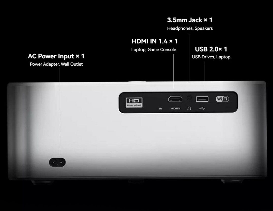 PV800 PRO легко соединяется с подавляющим большинством ваших устройств — благодаря четырём продуманным мультимедийным портам: USB-A, HDMI IN, 3,5 мм аудиоразъёму и разъёму питания AC-PV800 PRO. Простое и бесшовное подключение для мгновенного старта развлечений на большом экране.