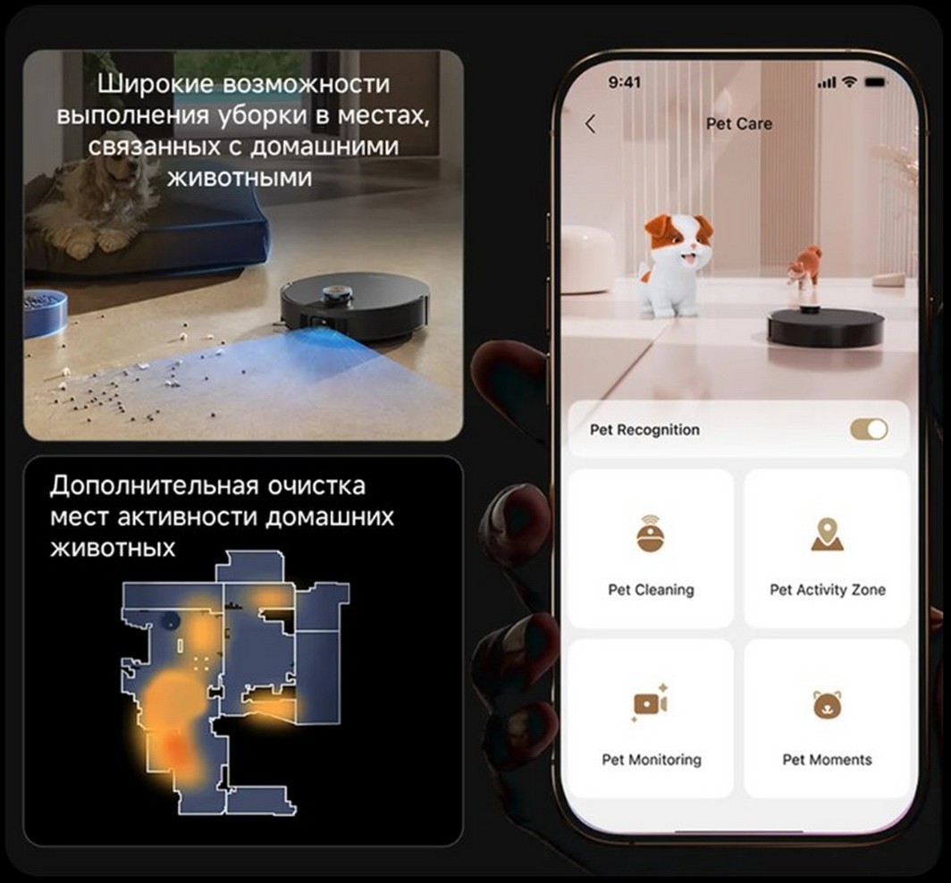 Matrix10 Ultra распознает и двигается осторожно в пространствах с домашними животными. Используйте приложение Dreamehome для взаимодействия со своими питомцами.