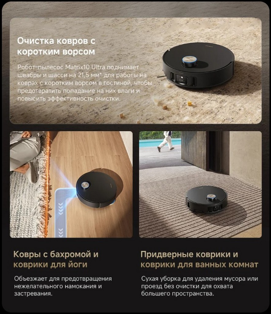 Ковер с длинным ворсом? Нужно просто снять швабры! Робот-пылесос Matrix10 Ultra автоматически снимает швабры для очистки ковров с длинным ворсом в спальне, чтобы они оставались сухими. Для бережной, но эффективной очистки применяется только сухая уборка.
