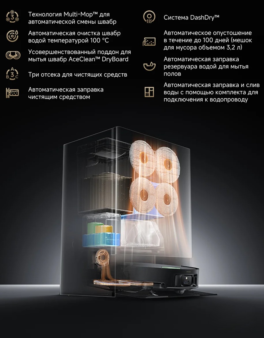 Робот-пылесос Matrix10 Ultra комплектуется системой высокотемпературной автоматической очистки, которая обеспечивает промывку швабр водой температурой 100 °C, и системой DashDry, которая обеспечивает сушку швабр, мешка и контейнера для мусора горячим воздухом. Благодаря этому станция остается идеально чистой без ручного обслуживания.