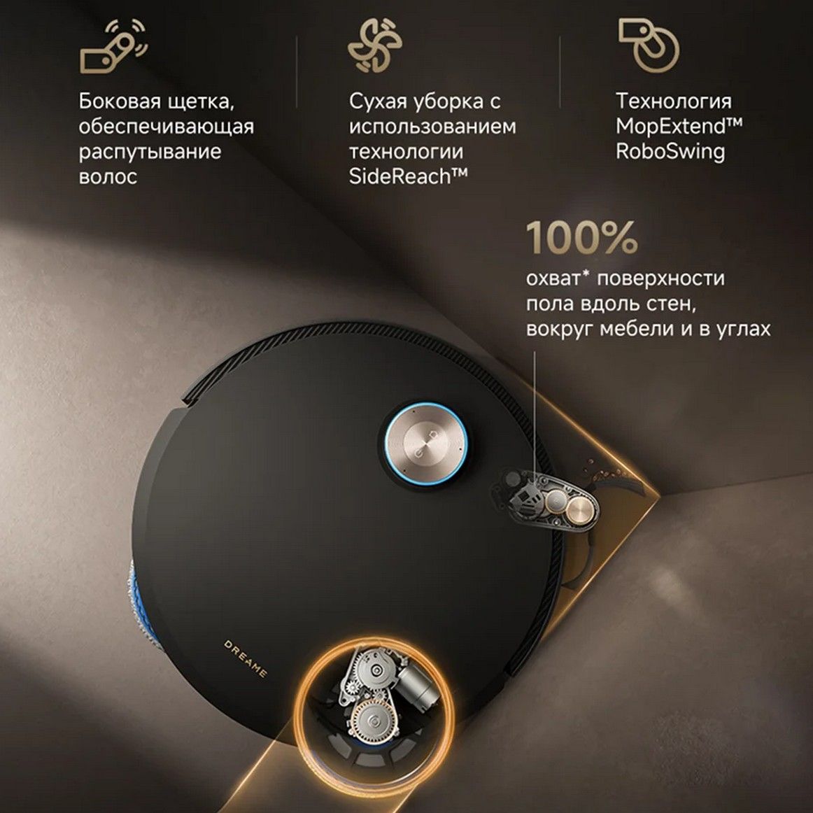 Технология MopExtend RoboSwing позволяет добираться до пространства в углах и под мебелью, а технология SideReacht помогает справляться с уборкой в труднодоступных местах для 100% очистки труднодоступных углов.