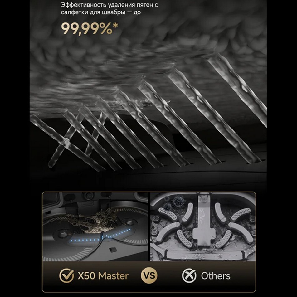 Благодаря наличию датчика цвета робот-пылесос Х50 Master может распознавать грязную воду и при необходимости регулировать объем воды, используемый для промывки швабр (32 уровня), а также повторно мыть сильно загрязненные участки пола. Это обеспечивает тщательную очистку, повышает эффективность использования швабр и позволяет экономить воду и энергию.