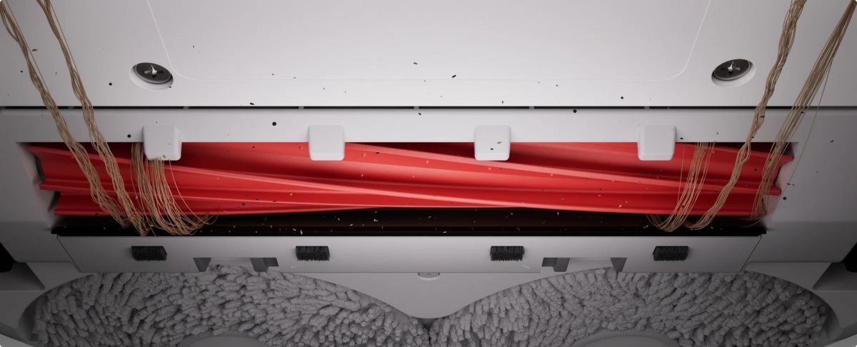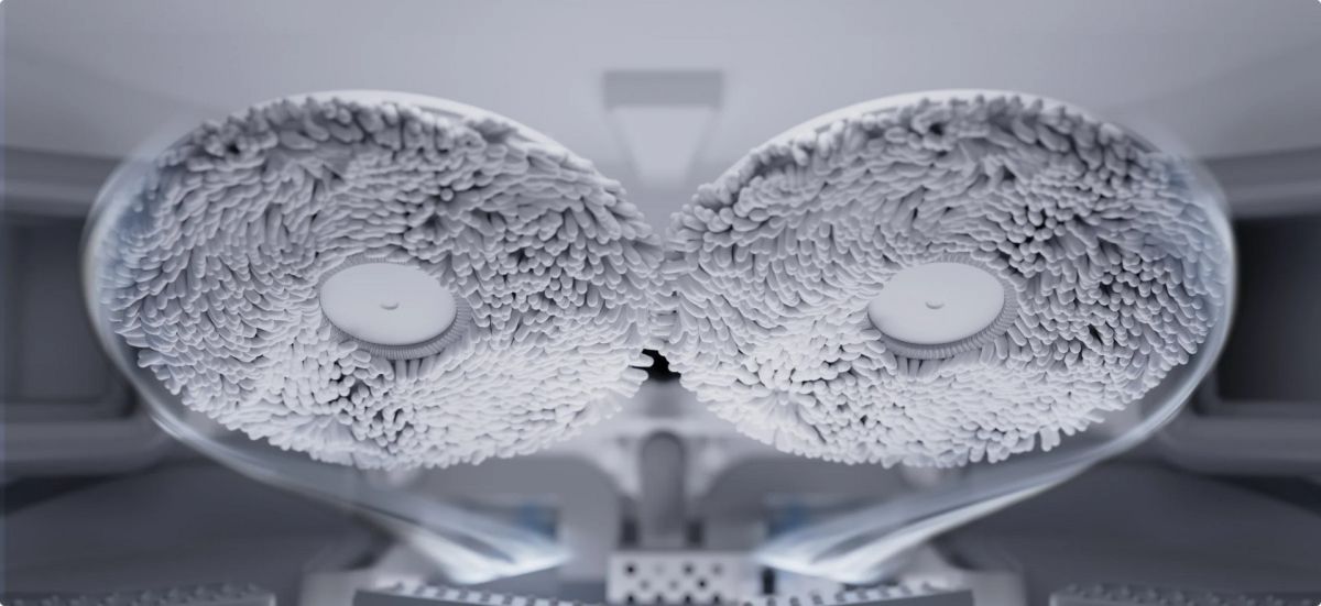 Благодаря инновационной дугообразной асимметричной конструкции, боковая щетка с защитой от наматывания использует центробежную силу в своих интересах. Это уникальное решение позволяет плавно направлять волосы к кончикам щетинок, облегчая очистку.