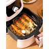 Горячий воздух циркулирует внутри рабочей емкости аэрогриля и нагревает продукты до нужной кондиции. В аэрогриле можно установить таймер от 1 до 60 минут. В результате продукты получают всесторонний и равномерный прогрев. И поскольку цикруляция происходит на протяжении всего процесса, блюда не подгорают.