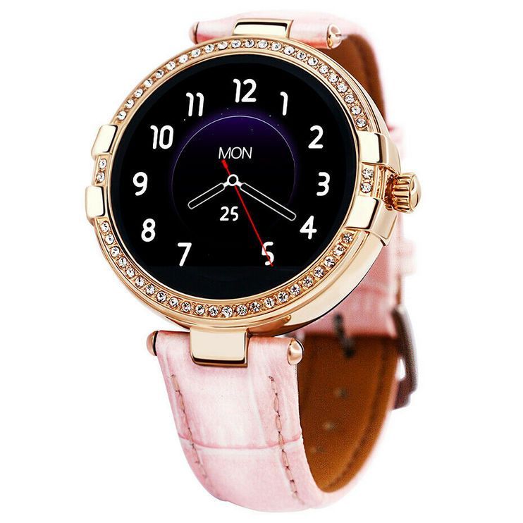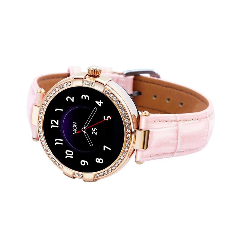 Женские смарт часы выполнены в классическом стиле. Корпус изготовлен из цинкового сплава, а ремешок из обработанного кожзама.